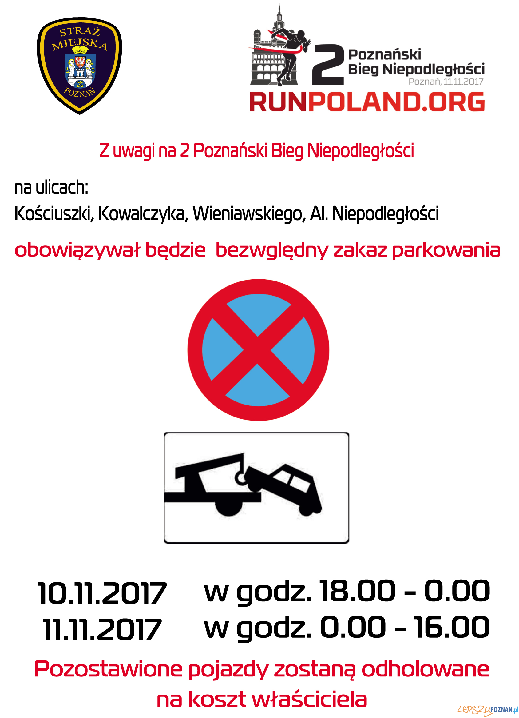 11 listopada na ulicach Poznania odbędzie się 2 Poznański Bieg Niepodległości. W związku z powyższym, na niektórych ulicach, nastąpi czasowa zmiana organizacji ruchu z zakazem parkowania i odholowaniem samochodu na strzeżony parking włącznie – ostrzega Straż Miejska.