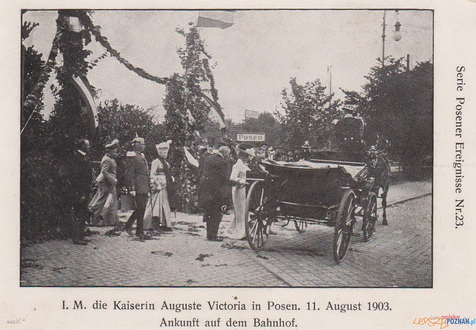Podług źródeł niemieckich na dworcu oczekiwali cesarzową: trzej synowie, wyżsi urzędnicy cywilni i wojskowi, między nimi naczelny prezes, prezydent policyi i prezydent kolejowy. Cesarzowa przy powitaniu odznaczyła rozmową naczelnego prezesa. Wśród okrzyków odjechała pojazdem do zamku.