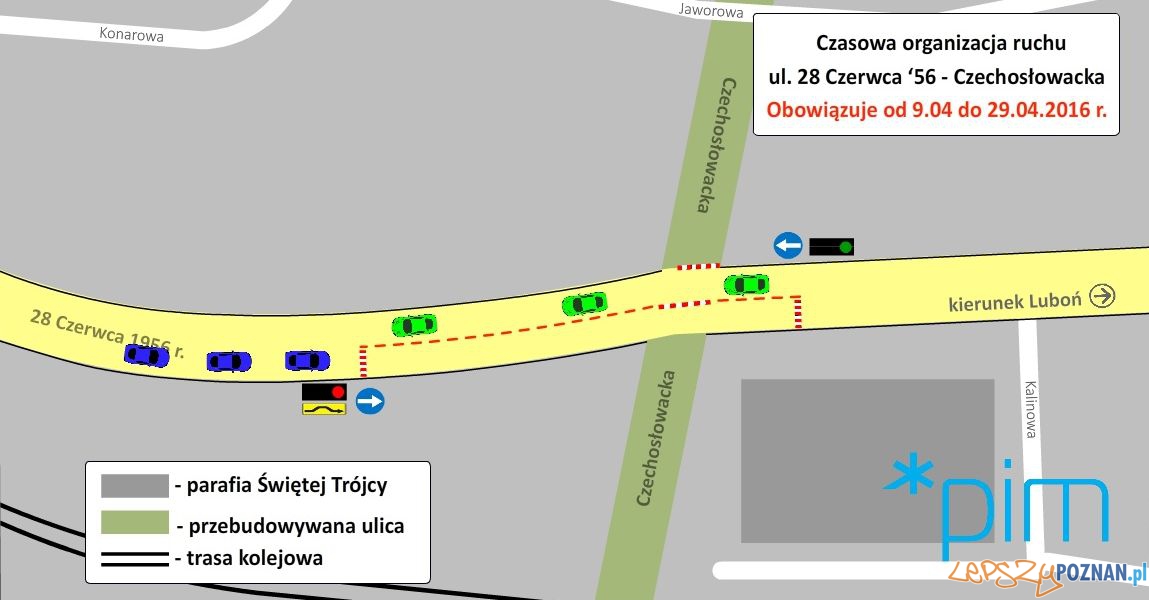 Jak informują Poznańskie Inwestycje Miejskie od 9 do 29 kwietnia wyłączony zostanie pas ruchu ulicy 28 Czerwca 1956 r., w kierunku Lubonia, na skrzyżowaniu z ul. Czechosłowacką.