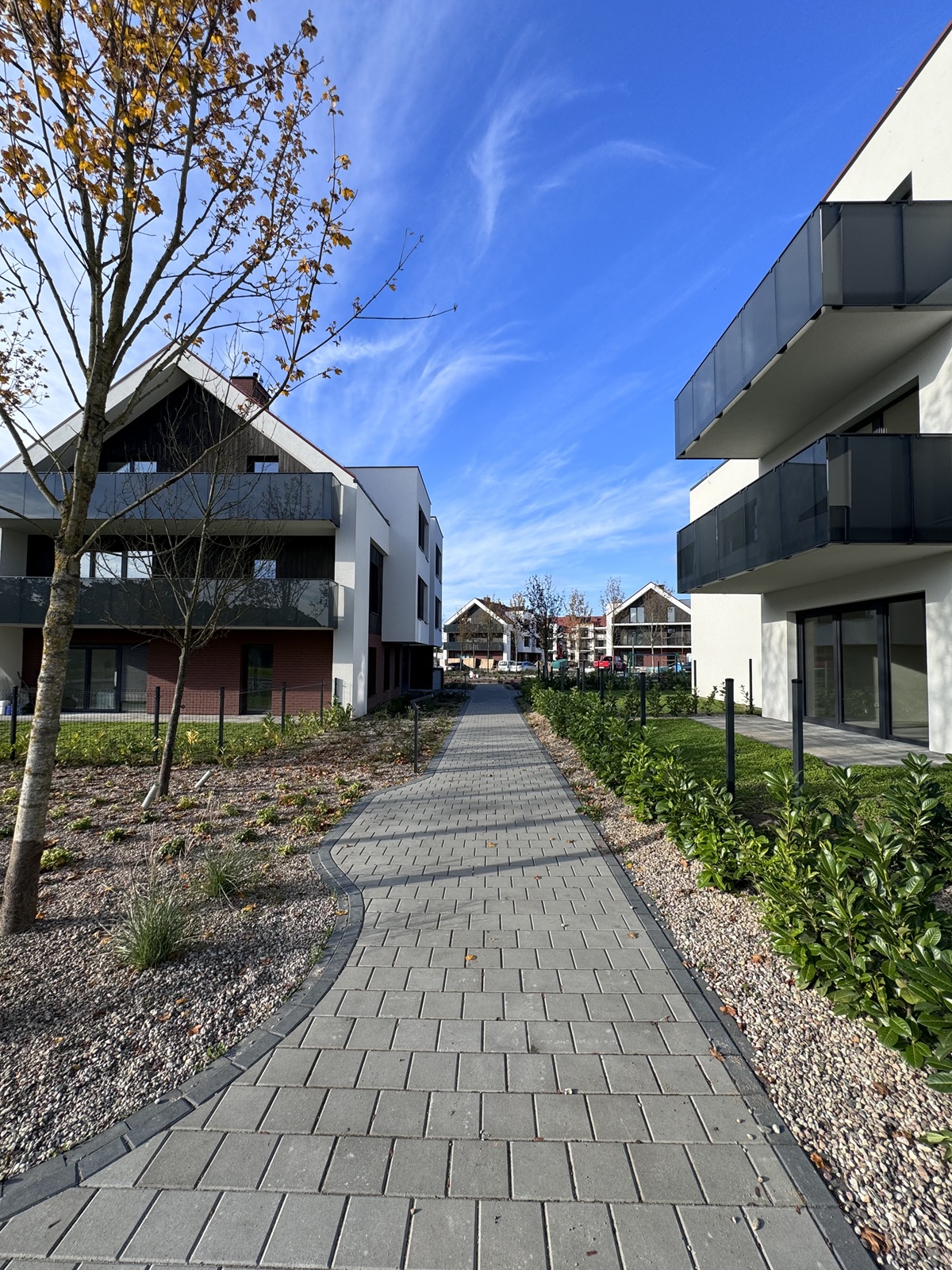 Pierwszy etap osiedla już został zrealizowany. W jego ramach powstały dwa budynki wielorodzinne z 24 mieszkaniami o powierzchni od 37 do 78 m². Każde parterowe mieszkanie ma przylegający ogródek, a lokale na wyższych kondygnacjach – balkony o powierzchni od 7 do 18 m². Dostępne są także domy szeregowe o powierzchni od 116 do 138 m² z działkami o powierzchni blisko 300 m².