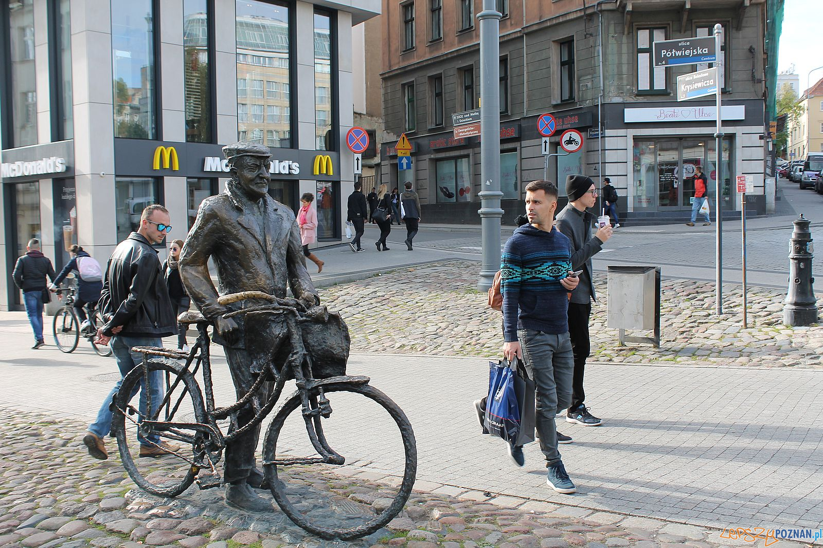 Ten szczun w ancugu i bobie z daszkiem prowadzący koło z teką na ramie to żaden ejber tylko akuratny poznaniak zmierzający być może z roboty w Ceglorzu do swojej famuły w chwaliszewskim fyrtlu. Po drodze pewnie zajdzie do składu albo kolonialki po sprawunki, być może po leberkę na skibki albo pyry na plendze, a że nie jest nyrol i ma wuchte bejmów to pewnie i lajsnie swoim gzubom klemy w tytce, żeby im się potem kalafa chichrała
