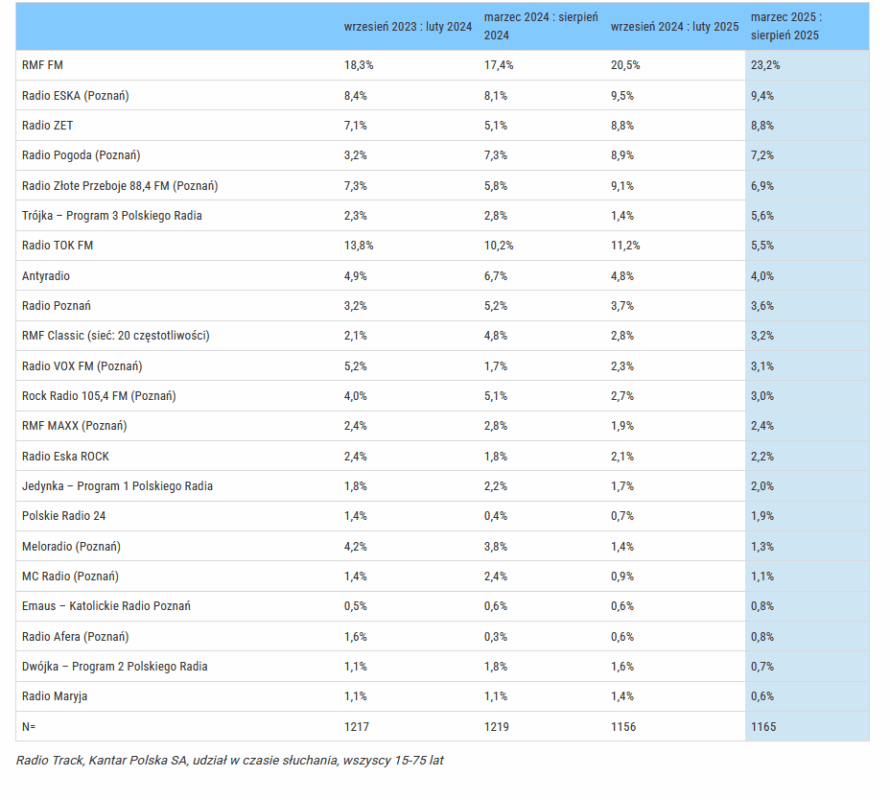Wśród mediów publicznych, Trójka – Program 3 Polskiego Radia utrzymuje się w czołówce z wynikiem 5,6%, skupiając słuchaczy wokół kultury i ambitniejszej publicystyki. Jednak lokalny, publiczny głos Wielkopolski – Radio Poznań, pomimo realizacji misji i koncentracji na sprawach regionu (samorząd, kultura lokalna, informacja z dróg), notuje udział na poziomie 3,6%. Ten wynik pokazuje wyzwanie, przed jakim stoją regionalne rozgłośnie – konieczność konkurowania lokalnym charakterem z masową rozrywką i wyspecjalizowanymi formatami sieci komercyjnych.
