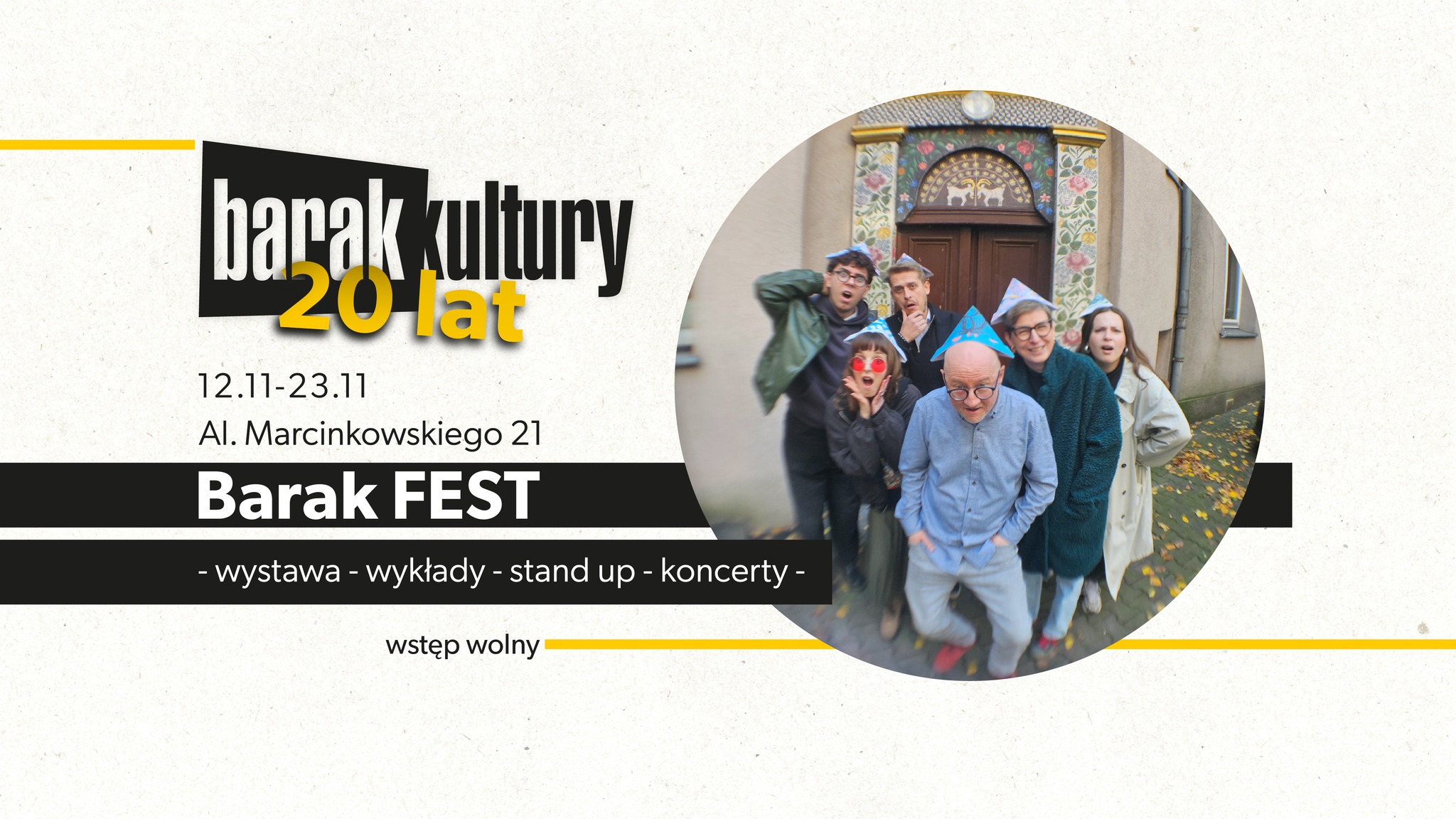 Fundacja Barak Kultury powstała 16 listopada 2005 roku jako inicjatywa skupiająca artystów, intelektualistów i pasjonatów kultury alternatywnej. Od początku istnienia Fundacja stawia na interdyscyplinarność, promowanie dialogu międzykulturowego oraz ożywianie poznańskiej sceny artystycznej. W tym roku Barak Kultury z dumą zaprasza na jubileusz, który będzie podsumowaniem dwóch dekad twórczej działalności i zachętą do dalszych eksperymentów artystycznych.