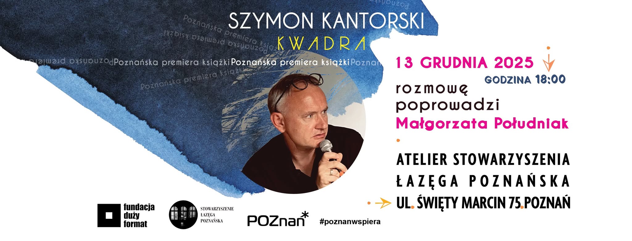 13 grudnia o godz. 18.00 w Atelier WIMAR, przy ul. Święty Marcin 75 w Poznaniu odbędzie się wyjątkowe spotkanie literackie, którego głównym bohaterem będzie Szymon Kantorski – poeta i współzałożyciel pisma artystycznego „Już Jest Jutro”. W centrum uwagi znajdzie się jego najnowsza książka poetycka „Kwadra” wydana przez Fundację Duży Format w Warszawie w 2025 roku. To wydarzenie organizowane przez Stowarzyszenie Łazęga Poznańska będzie okazją do spotkania z jednym z najważniejszych współczesnych głosów poetyckich Poznania oraz rozmowy o poezji, która brutalnie wkracza w codzienną rzeczywistość.