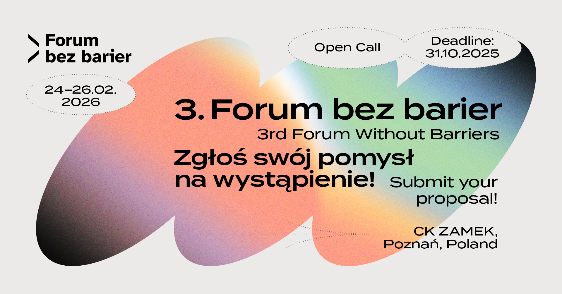 - Do 31 października 2025 – termin nadsyłania zgłoszeń na wystąpienia w ramach Open Call’u 3. Forum Bez Barier