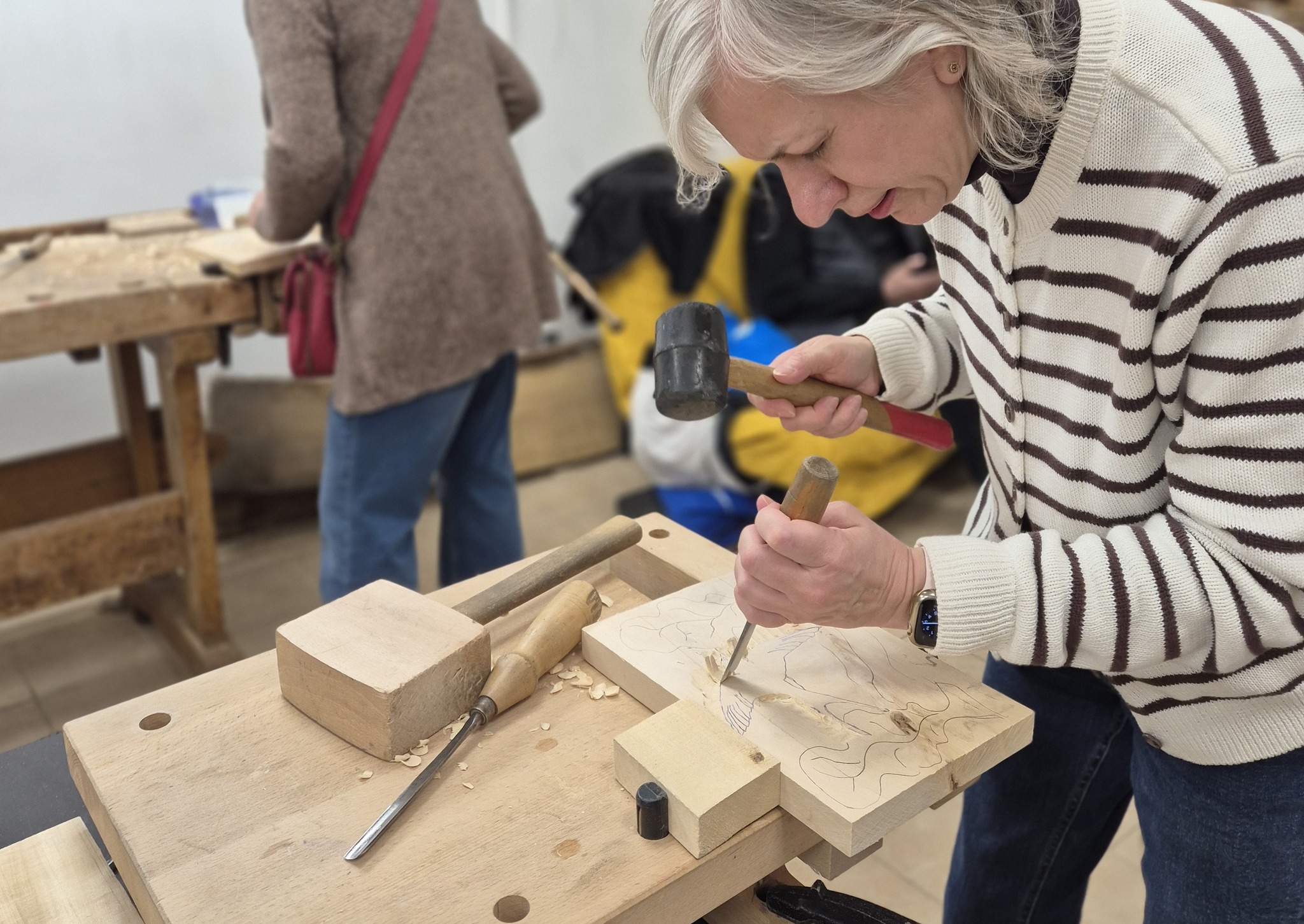 Nieodzownym elementem warsztatów jest praktyczna nauka obsługi klasycznych narzędzi rzeźbiarskich. Pod okiem Agnieszki Szablikowskiej-Trusewicz uczestnicy poznają podstawowe techniki pracy z dłutem, nożykiem czy pobijakiem. To niezwykle cenne doświadczenie, które pozwoli zrozumieć zarówno precyzję pracy mistrza, jak i wysiłek potrzebny do powstania pięknych form i faktur. Praca z tradycyjnymi narzędziami uczy cierpliwości, precyzji i pozwala lepiej zrozumieć materiał – sezonowane drewno lipowe staje się w pełni “żywym” tworzywem w rękach twórcy.