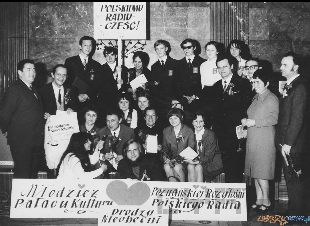 Pracownicy Poznańskiej Rozgłośni Polskiego Radia z wizytą w Pałacu Kultury (dzisiaj CK Zamek), Opis: stoją: pierwszy z lewej Jan Szajek, dyrektor Pałacu Kultury, obok niego Andrzej Napierała, trzeci od prawej Józef Ratajczak, siedzą: Maria Napierałowa, obok niej Adam Kochanowski, niżej Piotr Frydryszek, pierwsza od prawej Kazimiera Korcz, obok niej Grażyna Wrońska, Data obiektu: 12.05.1972, źródło: Cyryl – Cyfrowe Repozytorium Lokalne