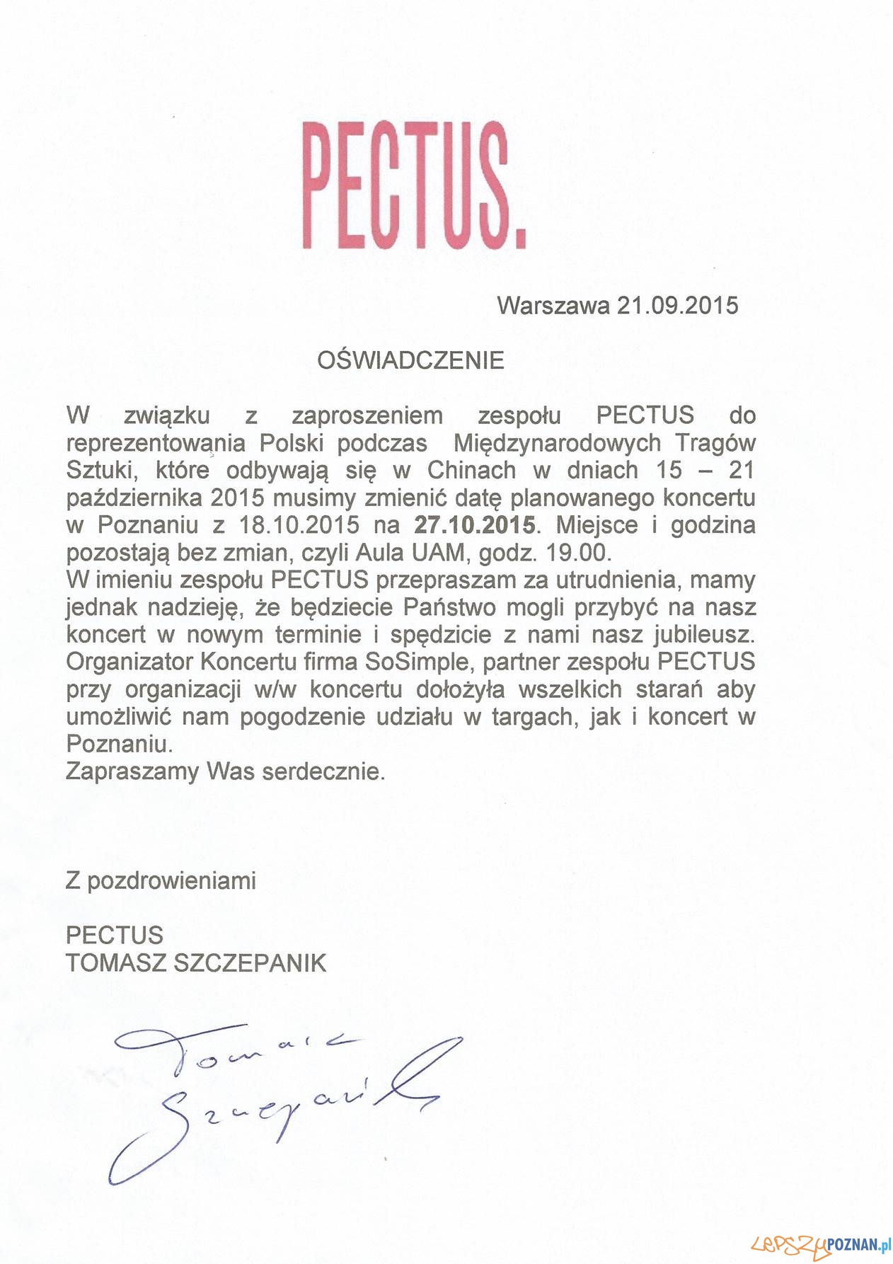 Pectus z okazji swojego 10-lecia zagra w Auli UAM w niedzielę 27 października o godzinie 19:00.