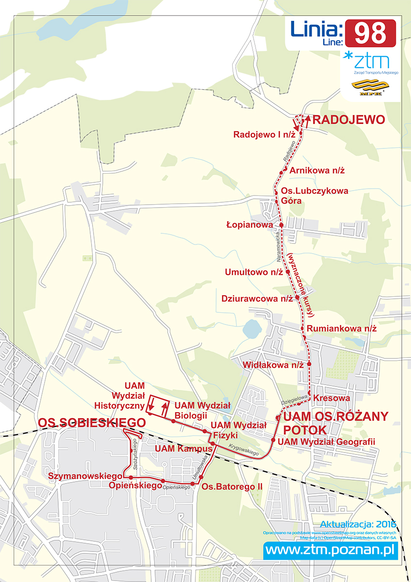 Na wniosek władz Uniwersytetu im. Adama Mickiewicza, autobusy w dni robocze w godz. 7.00-20.00 (w święta w godz. 7.00 – 17.00) wjeżdżać będą w głąb Kampusu UAM na Morasku. Autobusy linii nr 98 (w obu kierunkach) zatrzymywać się będą na przystankach obok obiektów uniwersyteckich: UAM Wydział Fizyki, UAM Wydział Biologii i UAM Wydział Historyczny.