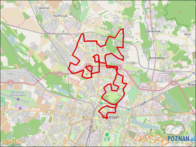 Plac Wolności (strona wschodnia za fontanną) – Al. Marcinkowskiego – Plac Wolności – Ratajczaka – 3 Maja – Pl. Ratajskiego – Libelta – Al. Niepodległości – Kutrzeby – Północna – Garbary – Armii Poznań – Winogrady – Zagonowa – Słowiańska – Gronowa – Winogrady – Zagrodnicza – Słowiańska – Murawa – Rondo Solidarności – Murawa – Lechicka – Umultowska – Tymienieckiego – Księcia Mieszka I (wjazd na drogę pieszo-rowerową) – przejazd pod Księcia Mieszka I na wysokości bloku Os. Śmiałego nr 34 w kierunku Os. Chrobrego 32 – przejazd drogą wewnętrzną przez Os. Chrobrego – Kostrzewskiego – Łowmiańskiego – Gieburowskiego – Wojciechowskiego – Kurpińskiego – Księcia Mieszka I – Trójpole – Piątkowska – Lechicka – Rondo Obornickie – Lutycka – Juraszów – Piątkowska – Al. Solidarności – Dojazd – Lutycka – Szczawnicka – Druskiennicka – Jasielska – Strzeszyńska – Omańkowskiej – Obornicka – Mateckiego – Przepaść – Stróżyńskiego – Szymanowskiego – Szeligowskiego – Braille’a – przejazd drogą wewnętrzną rzez Os. Batorego – Umultowska – Dzięgielowa – Naramowicka – Błażeja – Jasna Rola – Naramowicka – Łużycka – Stoińskiego – Umultowska- Połabska – droga wewnętrzna Os. Zwycięstwa (skręt za Biedronką) – Murawa (wyjazd przy pętli autobusowej) – Dobrowolskiego – Skotarska – Włodarska – Naramowicka – Serbska – Wilczak – Szelągowska – Garbary – Małe Garbary – Wolnica – Al. Marcinkowskiego – Pl. Wolności (strona wschodnia za fontanną).
